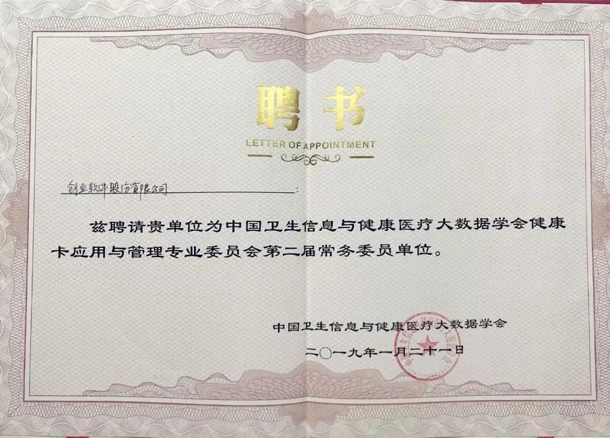 【合作伙伴】創業軟件受聘成為中國衛生信息與健康醫療大數據學會健康卡應用與管理專業委員會第二屆常務委員單位