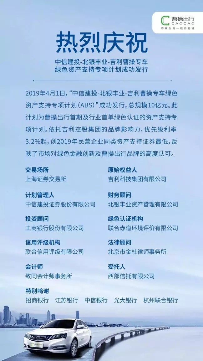 【合作伙伴】曹操出行首單綠色ABS成功發行